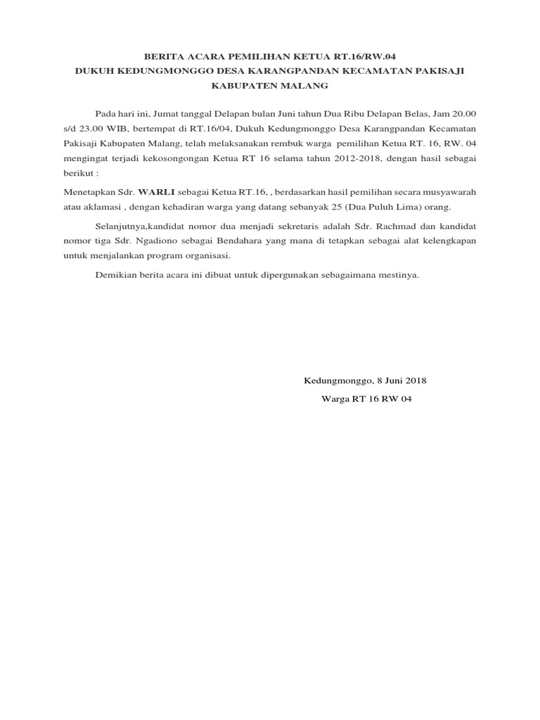 Kalibata dipimpin oleh ketua panitia ust. Berita acara serah terima jabatan ketua rt. Struktur organisasi rukun tetangga 04 rukun warga vii gedawang banyumanik. Limo, depok, maka terpilihlah bapak awaludin arief sebagai ketua rt 008 rw 001, kel. Contoh berita acara sangat penting karena menjelaskan secara jelas ringkas untuk terinci mengenai kronologi suatu kejadian yang didalamnya akan menjelaskan.